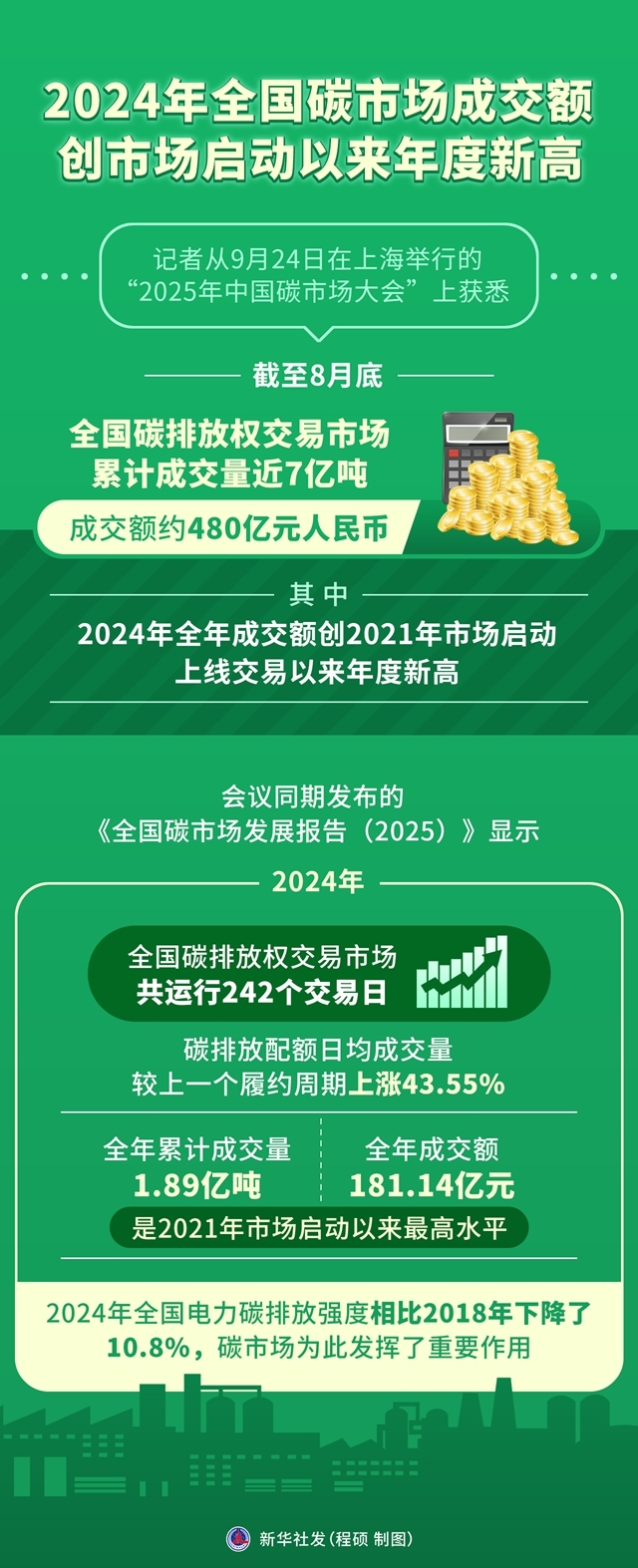 记者从9月24日在上海举行的“2025年中国碳市场大会”上获悉,截至8月底,全国碳排放权交易市场累计成交量近7亿吨,成交额约480亿元人民币。其中,2024年全年成交额创2021年市场启动上线交易以来年度新高。
