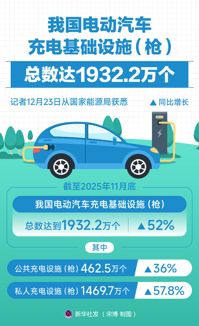 记者12月23日从国家能源局获悉,截至2025年11月底,我国电动汽车充电基础设施(枪)总数达到1932.2万个,同比增长52%。